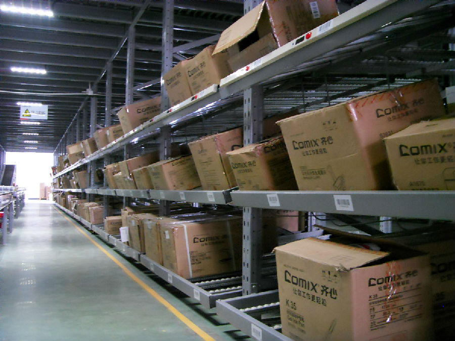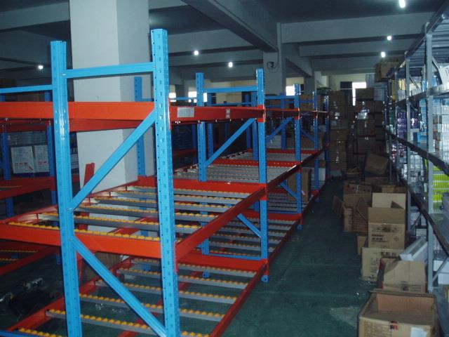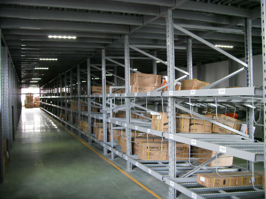 利用貨物自重實(shí)現(xiàn)貨物的先進(jìn)先出,貨物從貨架的背后放入,前面取出。并可實(shí)現(xiàn)一次補(bǔ)貨,多次取貨。